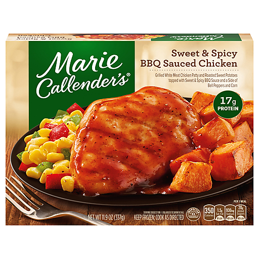 Satisfy your cravings for a comforting homestyle meal with Marie Callender's Sweet and Spicy BBQ Sauced Chicken. In this delicious prepared meal, a juicy grilled white meat chicken patty and roasted sweet potatoes are topped with sweet and spicy BBQ sauce and paired with a vibrant medley of bell peppers and corn drizzled in a buttery, sweet sauce. This frozen meal has 17 grams of protein, no artificial flavors or colors and no preservatives. Each single serve microwave meal can be prepared in just minutes in the microwave or oven for nights you don't want to cook dinner or afternoons you need a quick lunch. Enjoy the combination of hearty, delicious ingredients in a Marie Callender's frozen meal for a homemade, comfort food taste.