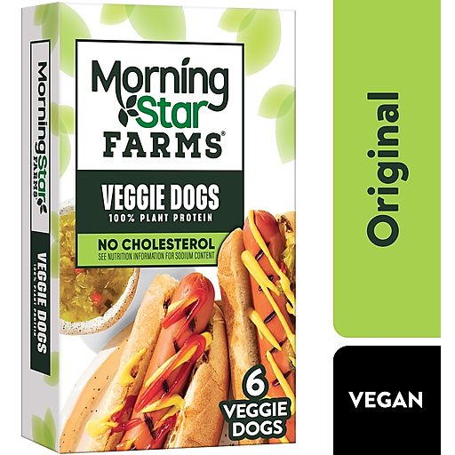 MorningStar Farms Veggie Dogs are plant-based and feature a delicious, hot-off-the-grill taste in every bite. Enjoy this delicious meat-free addition to a balanced diet. With 92% less fat than the leading chicken and pork hot dogs* and at only 60 calories per link, MorningStar Farms veggie dogs are easy to throw on the grill and share with friends and family; Try a veggie dog that's low fat, contains 0g trans fat, and cholesterol free (contains 0g monounsaturated and polyunsaturated fat per serving, see nutrition information for sodium content). Pair these delicious veggie dogs with your favorite summer sides like potato chips and side salads. Whether you're seeking a quick and convenient lunch or dinner or are grilling up a summertime barbecue, MorningStar Farms Veggie Dogs are sure to delight vegetarians and meat-lovers alike. *The leading chicken and pork hot dogs contain 9g total fat per serving (42g). MorningStar Farms Veggie Dogs contain 0.5g total fat per serving (40g).